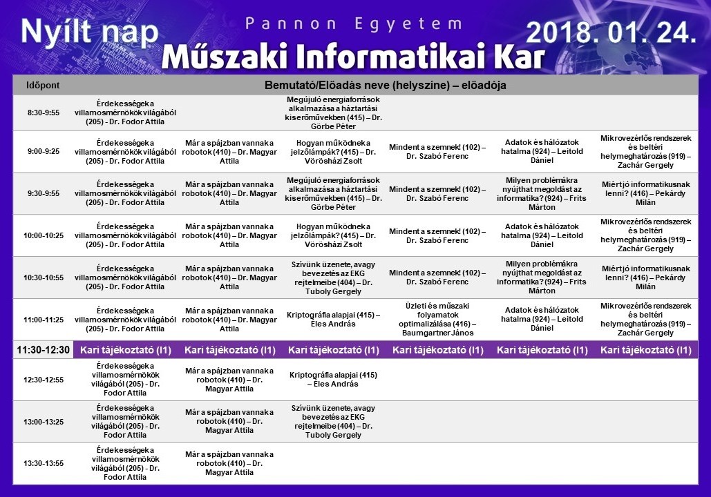 2018. január 24-én Nyílt nap lesz a Pannon Egyetem Műszaki Informatikai Karán, ahol izgalmas és érdekes laborbemutatókonés szakmai előadásokon vehetsz részt minden érdeklődő. A Nyílt napon a Rendszer- és Számítástudomány Tanszék munkatársai is részt vesznek.